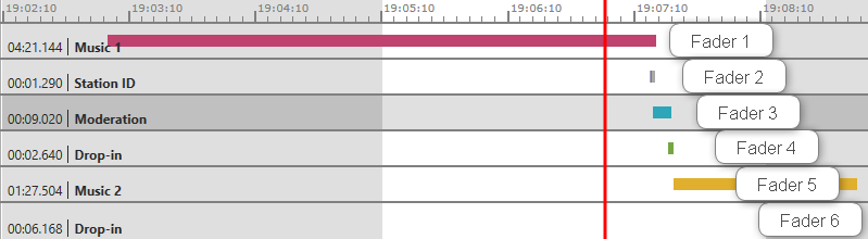 Typically the elements would alter between faders so that the first element would start on the first free fader the next element on the next free fader and so on.