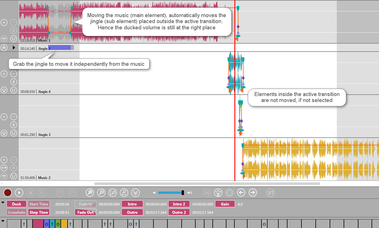 Here is another example. If you have ducked the music and once saved, elements on collapsed tracks are automatically moved with its related main element. Now you may easily move the music element and its jingle by moving the music. The jingle located on a collapsed track is connected to its music and moves together with the music element. If you want to move the jingle only, but not the music, click on the jingle and move it. The main element stays where it is. When the jingle's Mark In crosses the active transition, its track expands again.