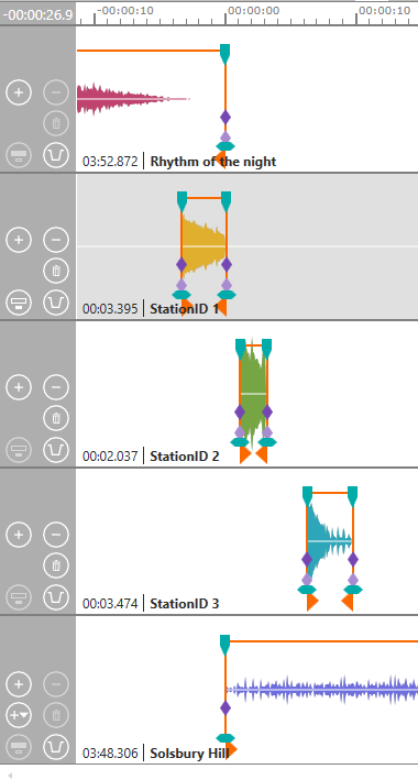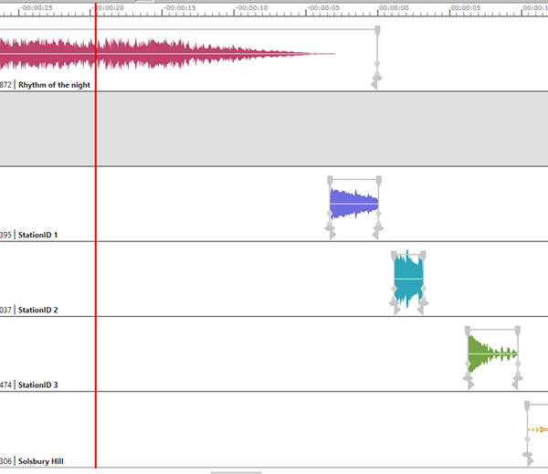 To insert the "StationID 1" jingle, press "DROP 1/START NORMAL/FADE OUT" (or "DROP 1/START DUCKED/DUCK/UNDUCK" if you want to have reduced volume). This makes "StationID 1" jump left to the current sound head position. "Rhythm of the night" continues to play, but you can use the "MUSIC 1/START NORMAL/FADE OUT" to fade out the music at any time.