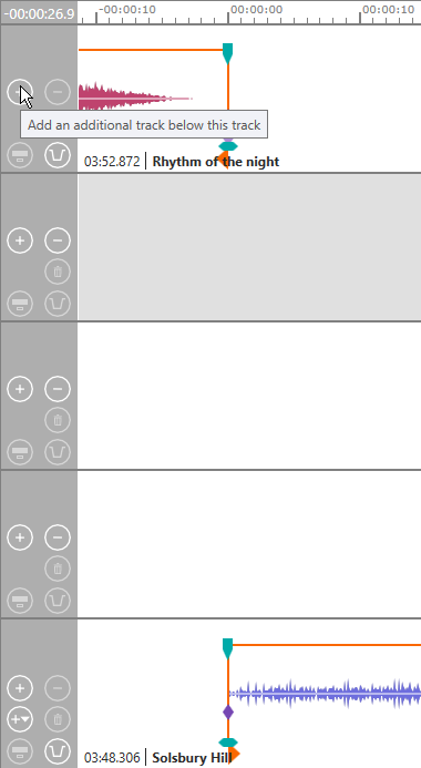 Click the "+" button in the head of track "Rhythm of the night" three times to insert three empty tracks. Is is a good idea to undock and enlarge the OTM window so that you can see all the tracks you are working with.