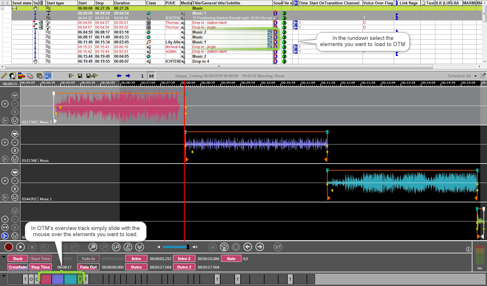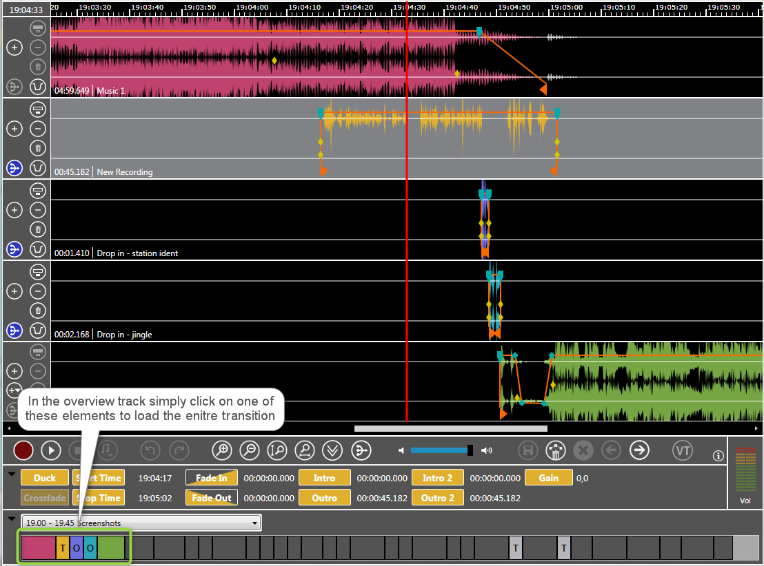 All elements of a transition are loaded to OTM, if only one single element of the transition is selected or dropped to OTM. A transition may contain overlaid or transition elements which are related to a main element. All these audio elements together are part of a transition. Here are different ways to load a transitions.