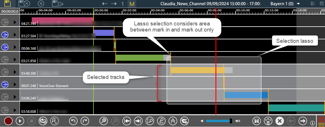 - If the mouse button is clicked over the track timeline, selection applies to all tracks whose audios are touched by the lasso.