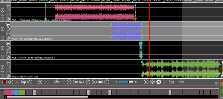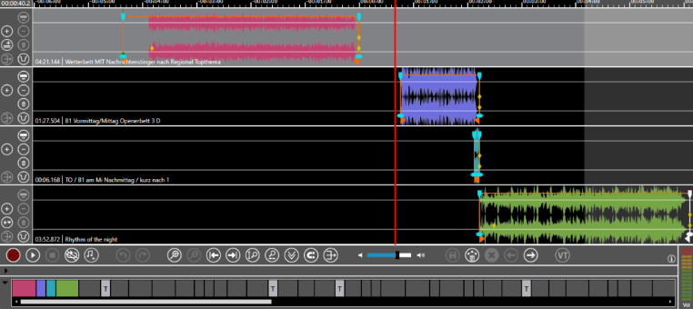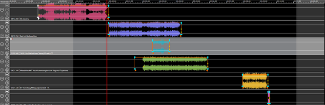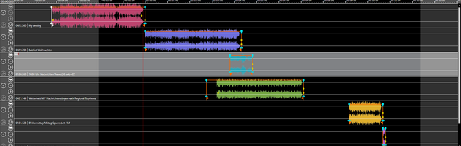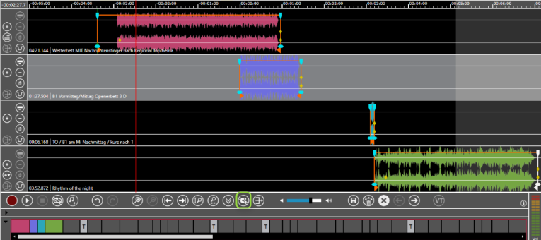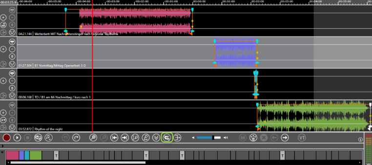 Now the journalist drags the light blue element in track 3 about 1 minute to the left. Because the feature is active the elements in track 4 to track 6 are also moved about a minute the left.