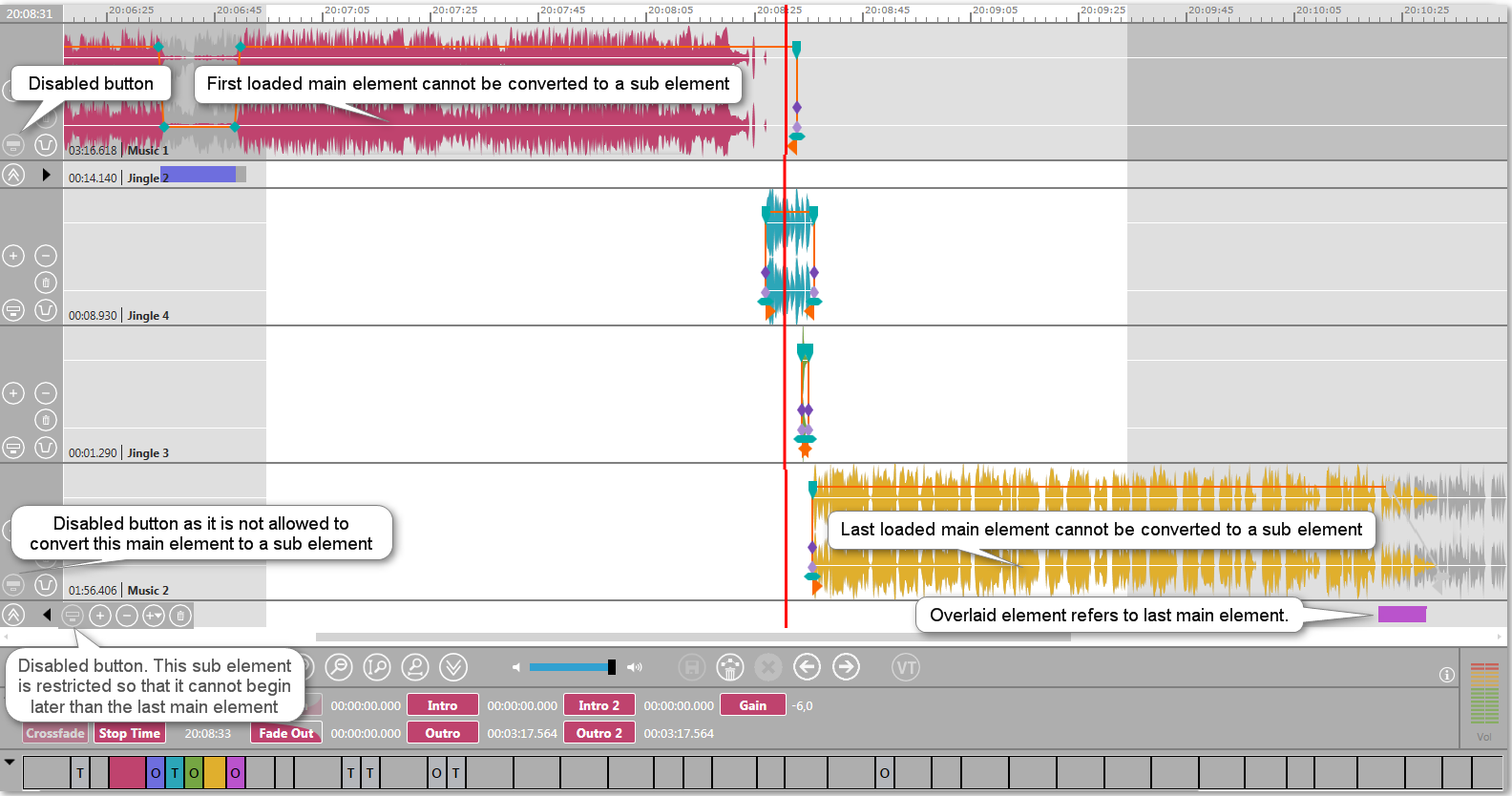 Also sub elements are restricted; if the sub element is the last loaded element, you cannot convert it to a main element. As shown in the below screenshot, the sub element on the last track cannot be converted to a main one as it must not start later than the last main element located on track five. As an overlaid element it is related to Music 2 and may start later.