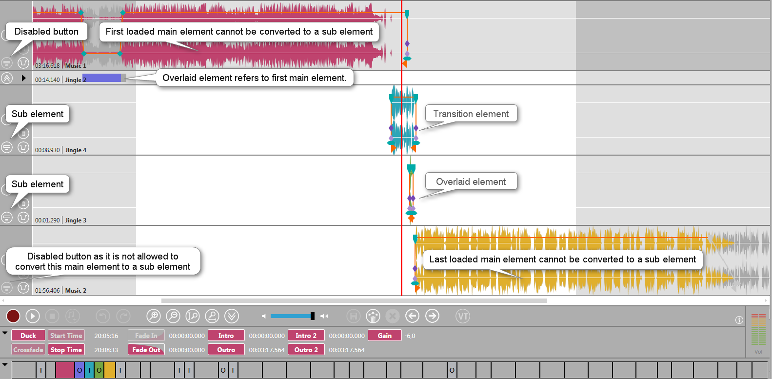 As mentioned before a sub element can be a "transition element" or an "overlaid element". OTM displays the type of sub element in its overview track by a "T" or "O" indicator.