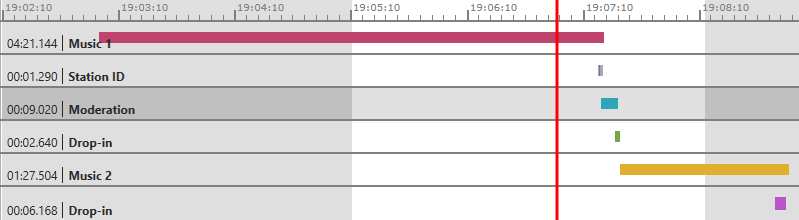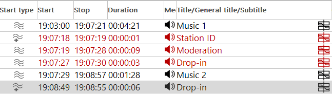 A typical transition consists of music elements and a couple of smaller elements like station IDs, drop-ins and recordings.