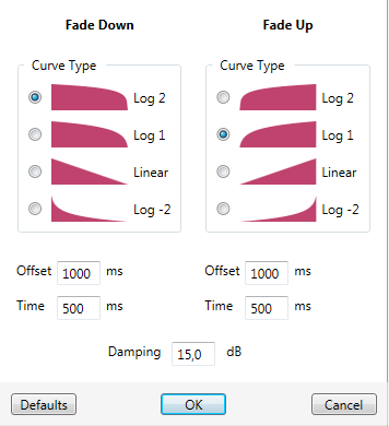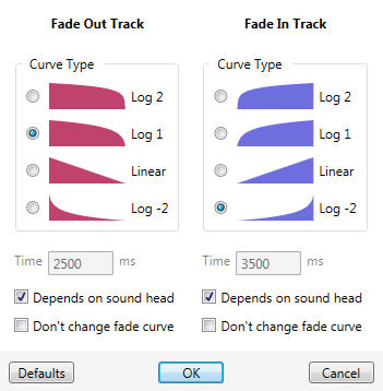 Time | Length of each fade curve in milliseconds; only usable if “Depends on sound head” is not active | ||