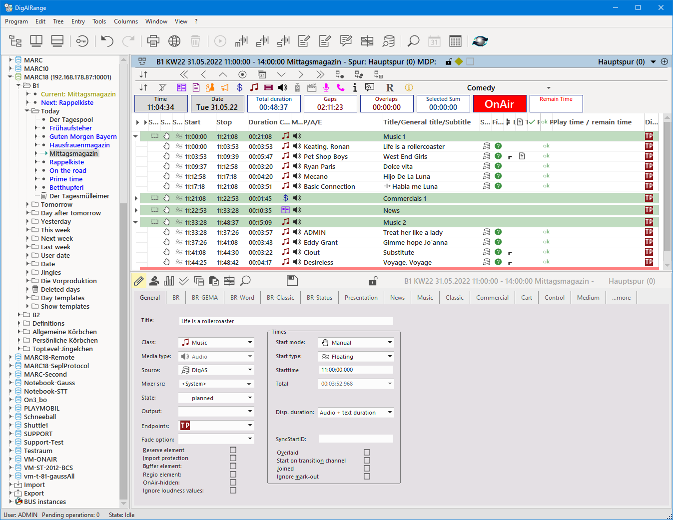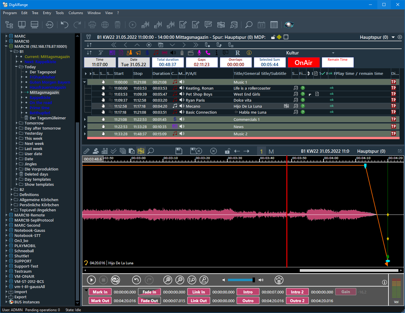 - SGU-1734: There is a new column for the rundown view available: "Playtime / Remaintime". If it is displayed, DigAIRange requests play info notifications from BCS. The column will display the playtime, the remain time, a progress bar and some additional information for elements playing in a TurboPlayer. If play info is available, it is used in the time windows, which display the remain time of the last playing on-air element and in OnAir-TrackMixer for the playout progress, too. This feature requires a BCS and TP v6, a WebSocket connection to BCS and that the generation of play info has been activated in TurboPlayer. For more information, please see TurboPlayerTechManual chapter 6.5 "Play info".