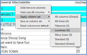 - SGU-4424, 4425: Implemented "column sets". A column set has a name and stores the column settings (=content, order, width) of one of the rundown list types in the registry (user, local, global). A new tab in the settings dialog is available to manage column sets. A right click onto the header of a rundown list brings a new context menu, which makes some operations with columns and column sets available. This menu is also available from the main menu of DigAIRange. A regular user can only manage column sets in his own user registry, whileas the user "Admin" can also manage local and global column sets.