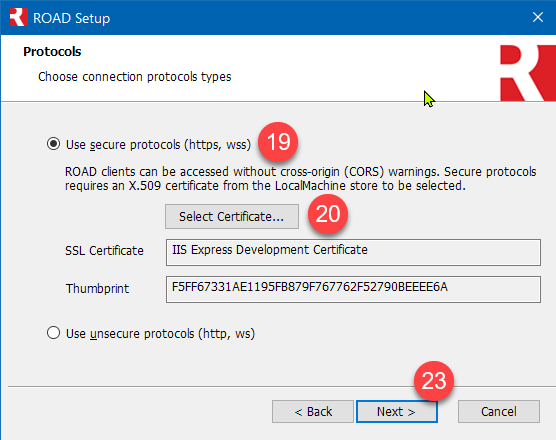 The Protocols dialog provide the option to choose between using secure protocols (https, wss) and unsecure protocols (http, ws) for the communication between the ROAD Service and ROAD clients. Using secure protocols requires a pfx certificate to available and valid for the domain name.