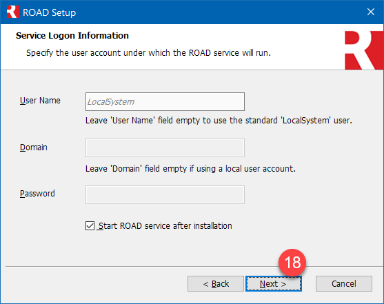 The ROAD core component runs as a Windows service. Services can run under a specific Windows account which you can specify in the Service Logon Information dialog. The account is automatically given the "Run as a service" privilege.