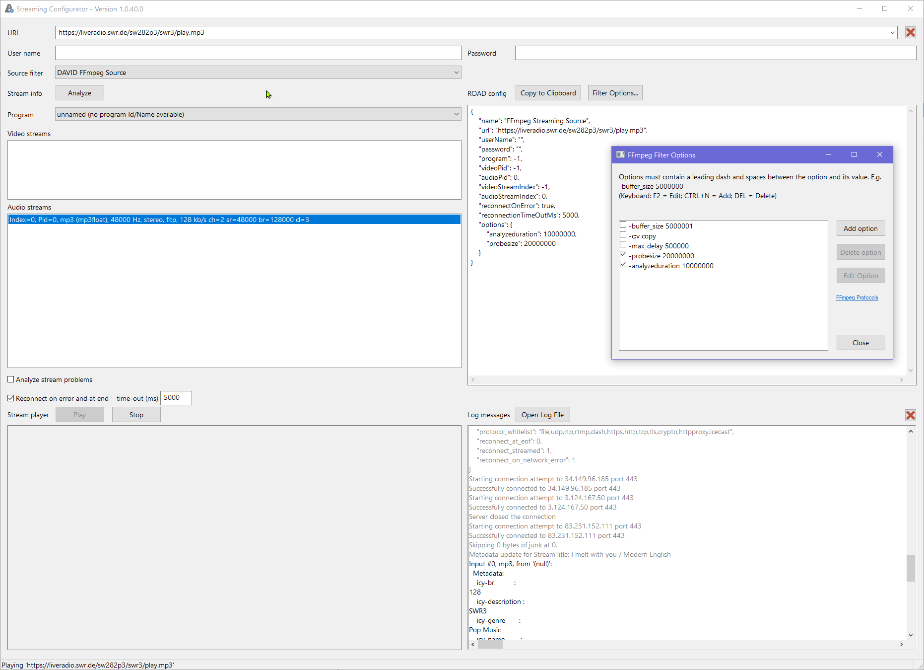 FFmpeg.exe. Use these options when the default settings are insufficient for reliable stream playback, and if the log file indicates that a specific parameter needs adjustment.