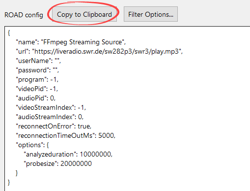 Press Copy to Clipboard to copy the ROAD configuration to the clipboard.