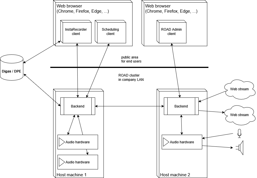 ROAD (Realtime Online Audio Distribution) is a scalable distributed audio processing system. Basically it consists of clients for end users and a backend, which can be installed on one or several host machines (which then build a ROAD cluster). Clients connect to the ROAD Service, which cares for processing audio jobs.