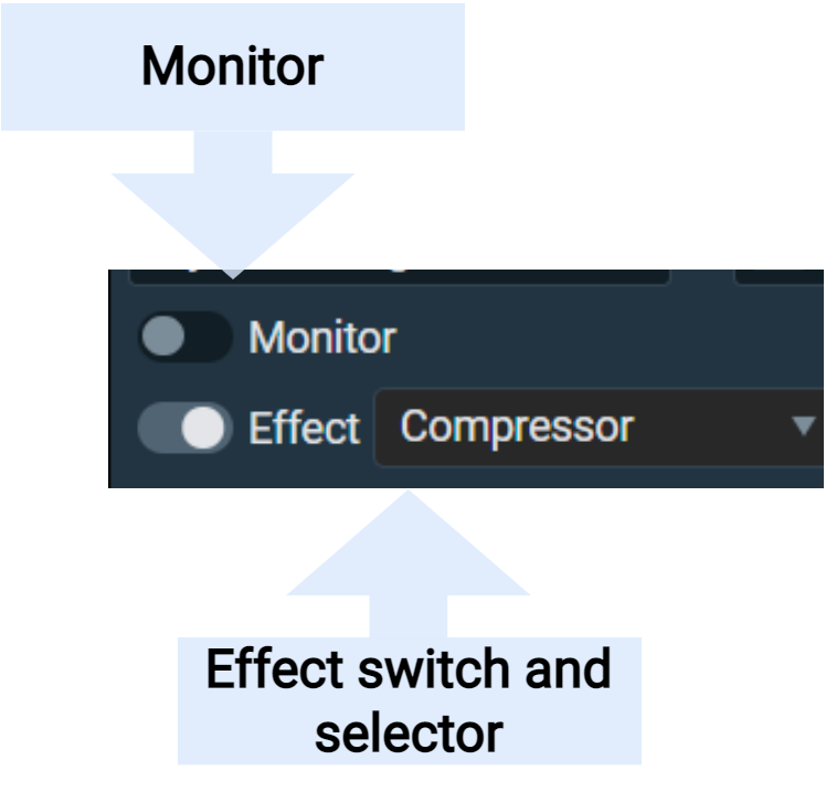 | Monitor, Effects | To monitor the live input audio, post-fader (but without effects) Effects can also be applied to the recording (a backup raw audio file will also be saved by default) See more about Effects and how to configure them. |