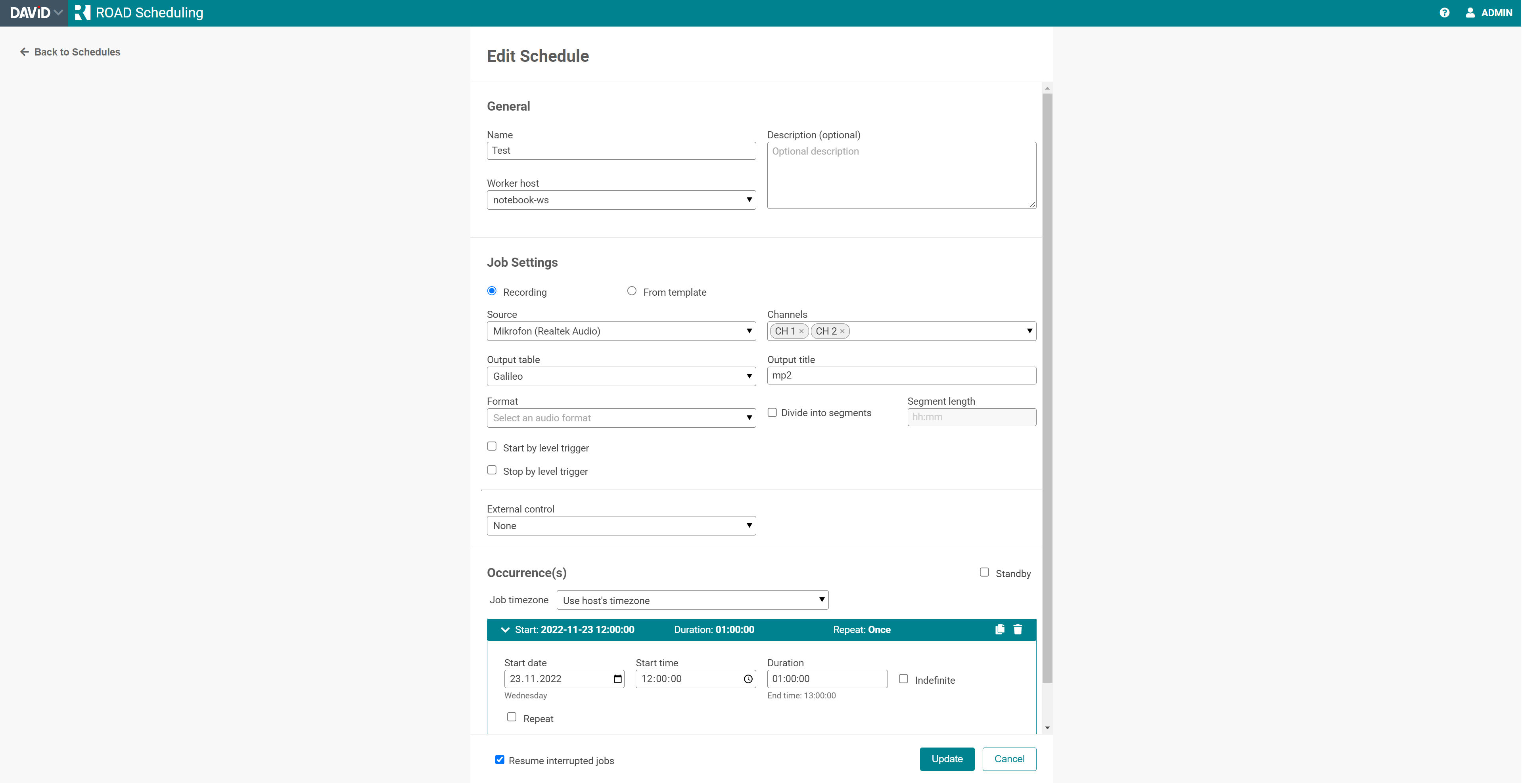 Option "Resume interrupted jobs": Select this option to make the scheduler resume a job if the Service is restarted while an occurrence is to be active (so either within the period between start and stop time or after start and indefinite). Updating an active schedule might also lead into restarting it with this option. It is recommended to use this option for all long-time schedules.