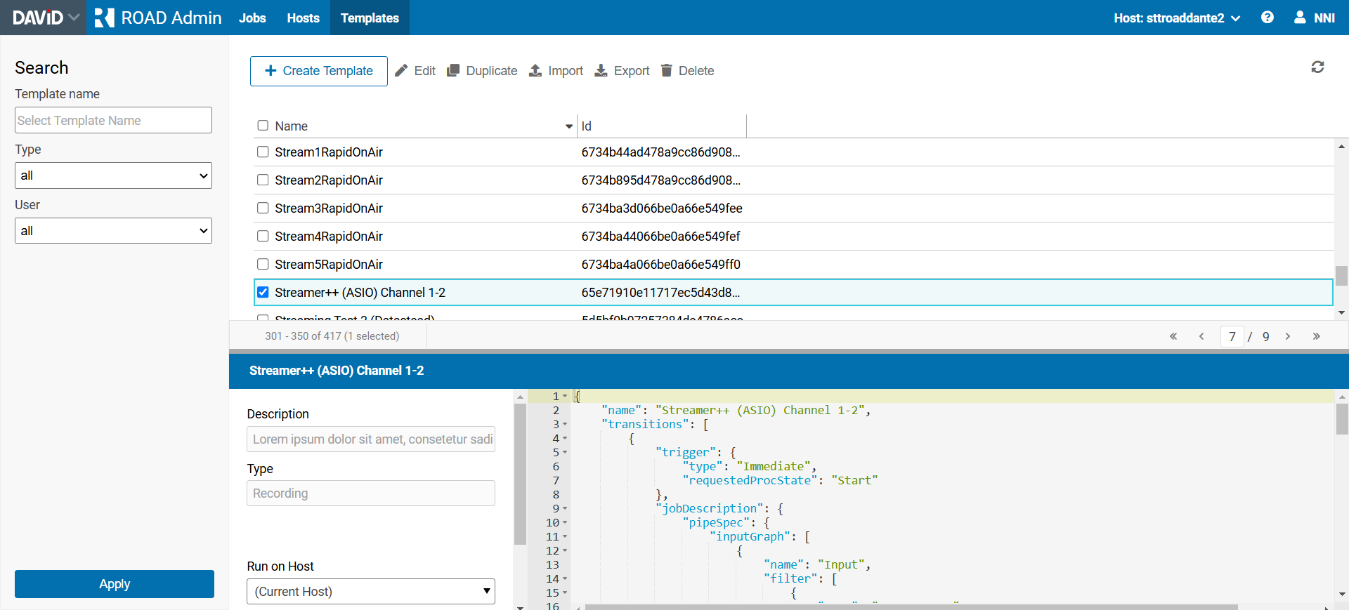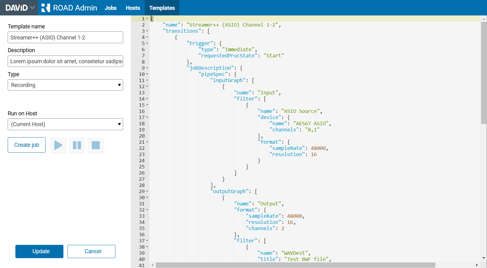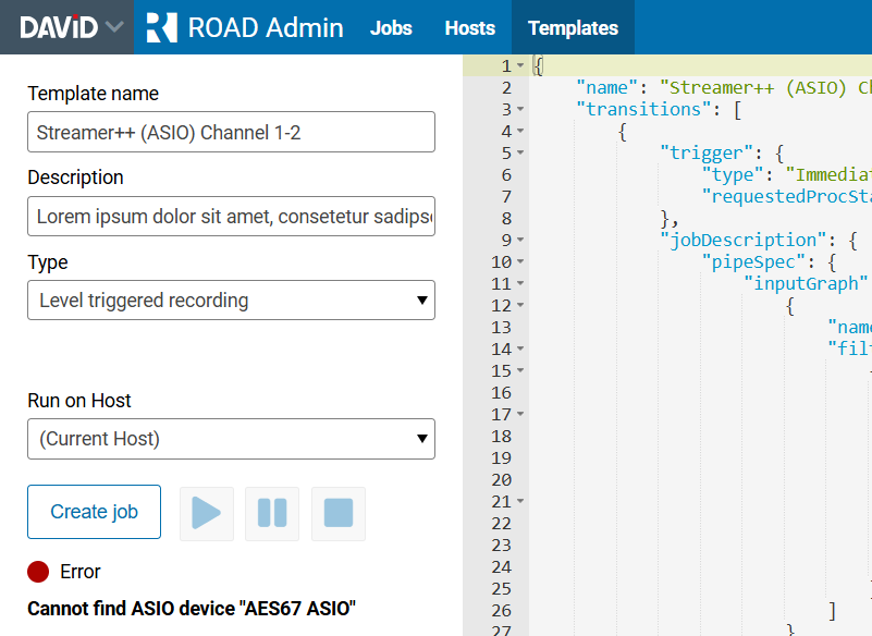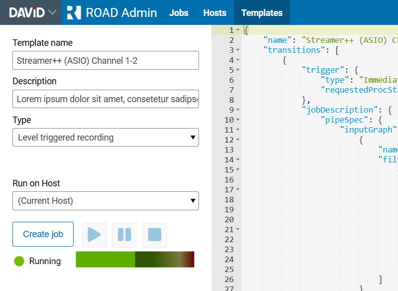 Note the template name is editable in the left area where the “name” field inside the JSON is the optional name of a job being created from it.