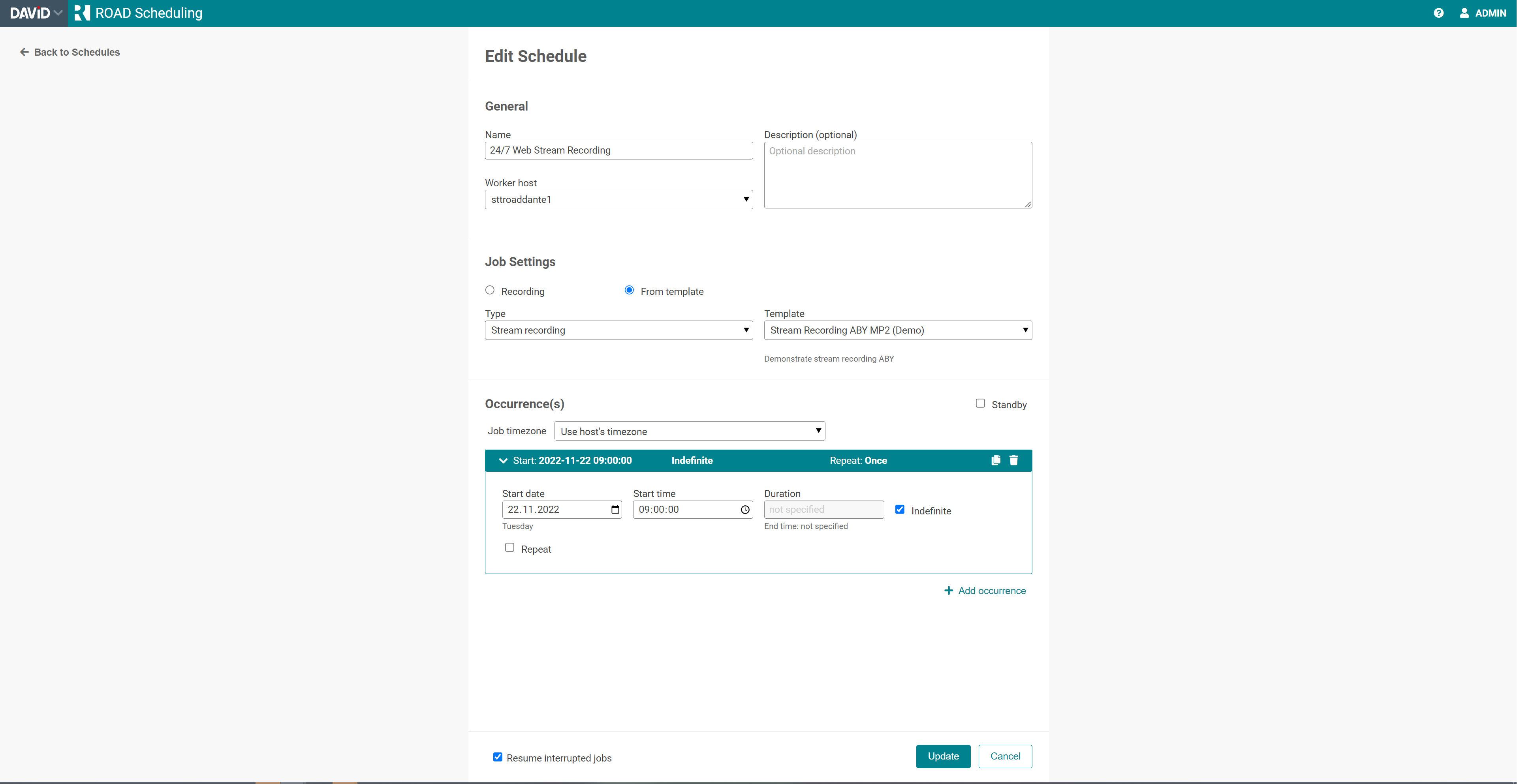 Option "Resume interrupted jobs": Select this option to make the scheduler resume a job if the Service is restarted while an occurrence is to be active (so either within the period between start and stop time or after start and indefinite). Updating an active schedule might also lead into restarting it with this option. It is recommended to use this option for all long-time schedules.