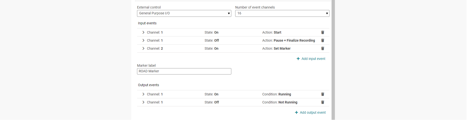 For input events: Connect the state (event) of an input channel of your device to to an action to be executed, e.g. a recording is started when a button is pressed