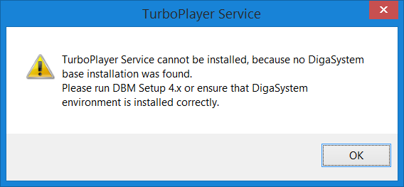 Symptom | When the TurboPlayerServiceSetup.exe is started the following error message is displayed: “TurboPlayer Service cannot be installed, because no DigaSystem base installation was found.” ![]() |