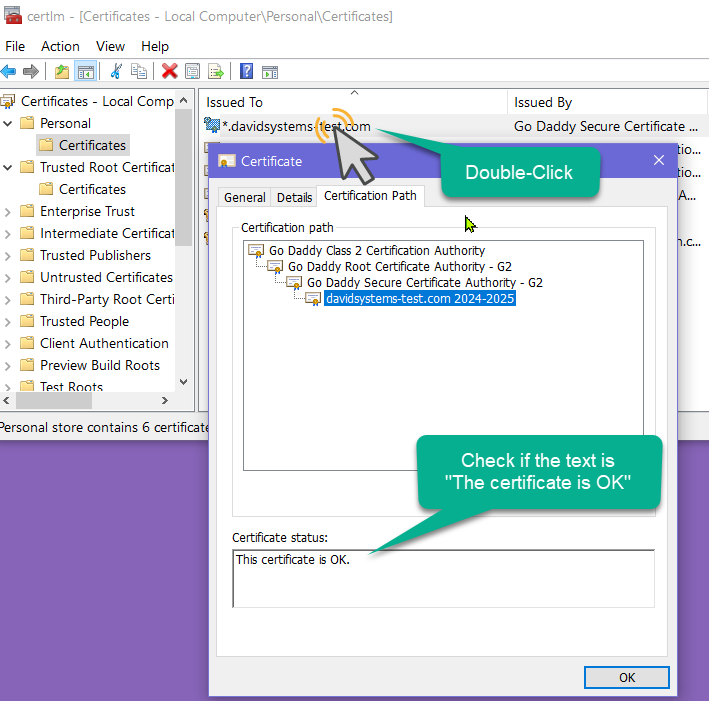 The certificate must be valid. You can verify its validity by double-clicking on the certificate. The certificate status on the Certification Path tab must display the text 'This certificate is OK.'