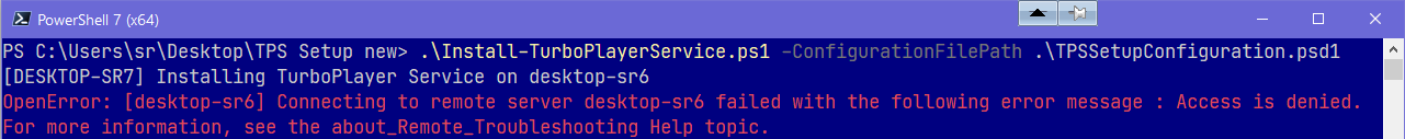 Symptom | When unattended installation of TurboPlayer Service on a remote computer is started, the following error message is displayed: “OpenError: [<computer name>] Connecting to remote server <computer name> failed with the following error message : Access is denied. For more information, see the about_Remote_Troubleshooting Help topic.” ![]() Error: PSRemoting disabled |