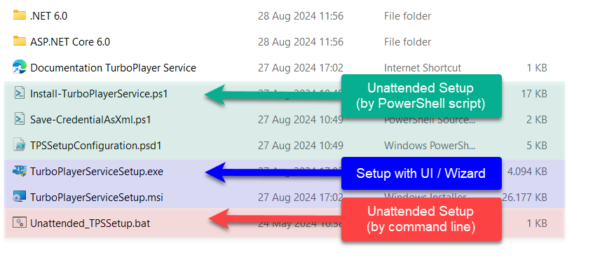 The TurboPlayer Service Setup folder contains several files for different installation scenarios.