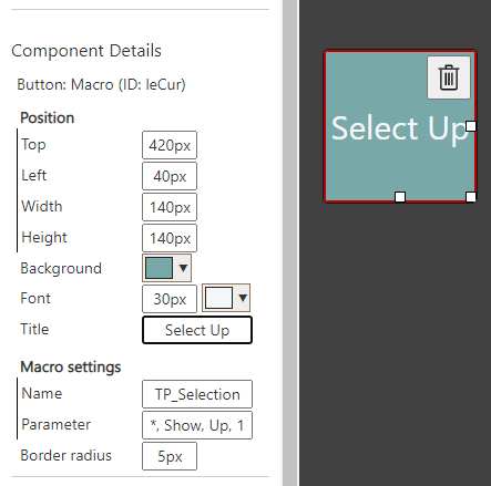 - for macro command TP_ChangeUserButtonProp specifictly, supported property name and value patterns include the following as examples: Background, #0000ff; Top, 100px; Left, 100px; Width, 50px; Height: 100px; Title, "User Button - New Title". (Font is not yet supported)
