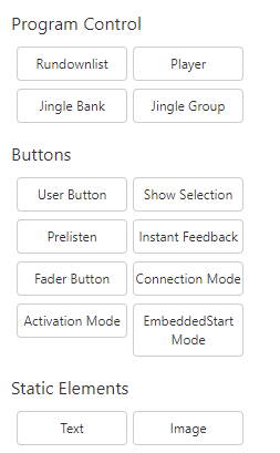 Add a component by clicking on the corresponding button in the GUI Designer. The list of components includes program controls, buttons and static elements. Every new component will be placed near the top left corner of the screen. It can then be edited as described in the following section.