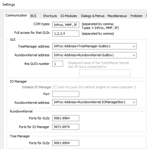 Each new full-access client which connects to TurboPlayerService will generate a new connect from the service to TurboPlayer engine. This means that each individual GUI – might it be a standard or a web GUI – is known to the engine. The differentiating factor is the GUI number, which therefore must be unique for each GUI. For the standard GUI you can configure in the settings which number is used. All GUI numbers which should be available to web GUIs must be listed in the parameter “GuiNumbersRange” and all numbers listed here must be included in the “PortsForGUIs” parameter of kernel and TreeManager.