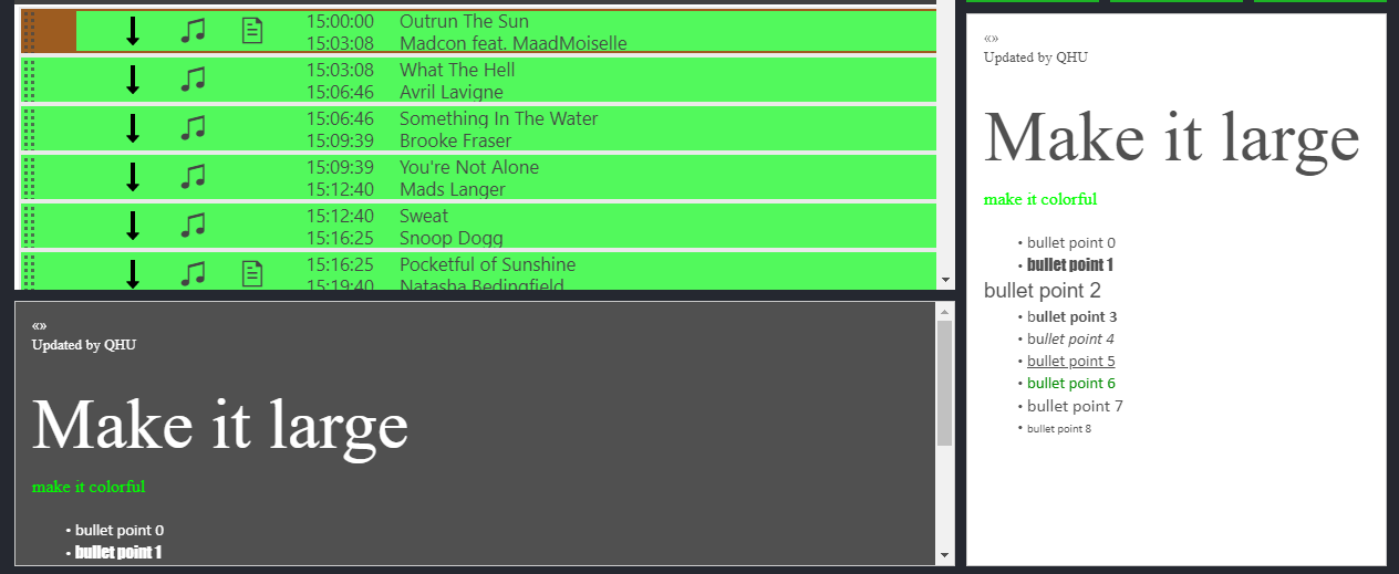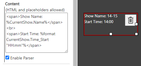 The Text component is able to parse placeholders, which give access to information of the current show. The option “Enable Parser” have to get set to activate this functionality. Placeholders follow a simple pattern: