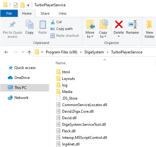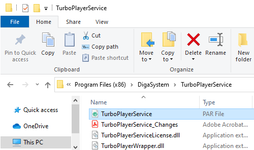 Copy all files of the installation package (or unzip) to a folder. If you have a folder with the DigaSystem modules you can use this folder, but this is not mandatory. In the following example, TurboPlayerService is a subfolder of the DigaSystem folder: