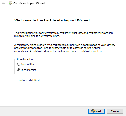 Step 2: Double click on the certificate to import it. The Certificate Import Wizard opens.