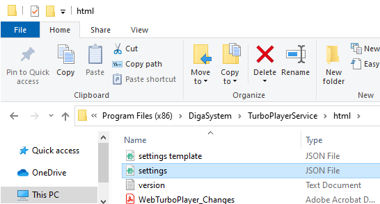Step 9: Edit the settings.json file located in the html folder of the TurboPlayerService folder: