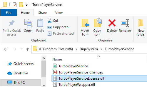 Copy all files of the installation package (or unzip) to a folder. If you have a folder with the DigaSystem modules you can use this folder, but this is not mandatory. In the following example, TurboPlayerService is a subfolder of the DigaSystem folder: