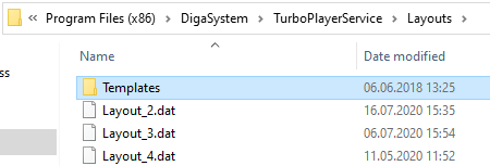 There is an additional folder where the layout settings of the different GUIs and templates for layouts are located. By default, it is the subfolder “Layouts” below the installation folder. If this folder does not exist it will be created automatically by TurboPlayerService.